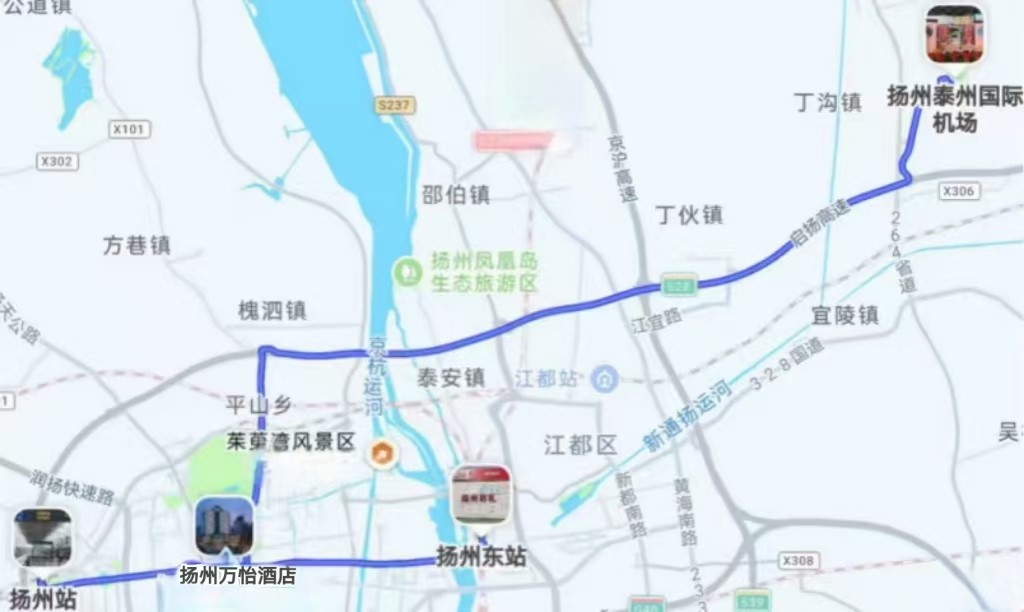 2.交通路线: 2.1 从机场到酒店 (1)乘坐出租车:出租车约45分钟,费用80元左右。 (2)公共交通:江苏扬泰机场乘坐扬泰机场扬州线大巴,在文昌花园南站下车,全程约50分钟;到站后换乘K1路公交车,在石塔寺站下车,然后步行约512米即可到达万怡酒店。 2.2 从火车站到酒店 2.2.1乘坐出租车 (1)扬州东站到酒店:出租车约30分钟,费用40元左右。 (2)扬州站到酒店:出租车约20分钟,费用25元左右。 2.2.2公共交通 (1)扬州东站到酒店:乘坐Z6/88路公交车,从东部客运枢纽上车,在石塔寺站或西门站下车(2元),下车后步行约512米/360米即可到达酒店。 (2)扬州站到酒店:乘坐Z6/88路公交车,在人民大厦站或西门站下车(2元),下车后步行约563米/385米即可到达酒店。